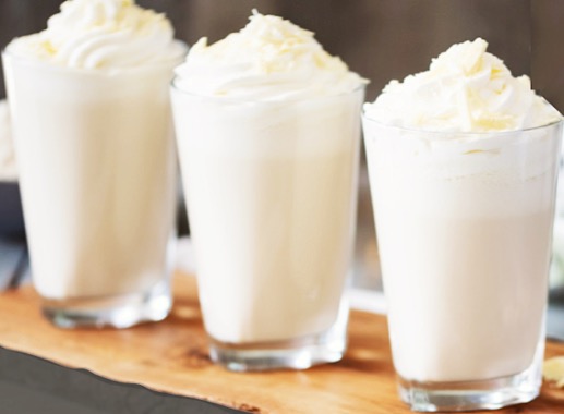 Le milkshake à la noix de coco et au chocolat blanc est une boisson composée de lait de noix de coco, poudre de noix de coco, sucre, chocolat blanc, glaçons, crème fouettée.